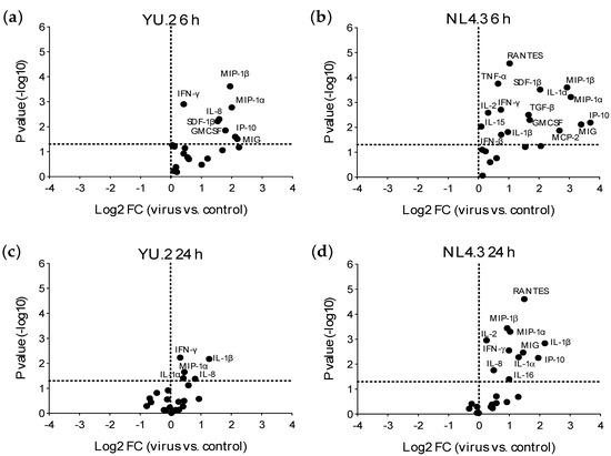 Modulation of colorectal cytokine profile induced by exposure to HIV-1. Volcano plots of all cytokines measured after 6 (a,b) or 24 h (c,d) of culture and comparing colorectal explants exposed to YU.2 (a,c) or NL4.3 (b,d) to those unchallenged (control). FC: fold change. Horizontal dotted line indicates a p value of 0.05. Analytes above this line are significantly modulated. Vertical dotted line is set at a Log2FC = 0. Data shown are from four independent experiments performed with tissue from different donors.