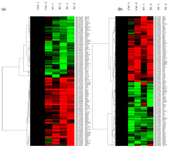RNA microarray data was analyzed in GeneSpring v11.5.1 (Agilent Technologies). In brief, data was normalized using quantile normalization and baseline transformed to the median of all control samples. Data was filtered to remove unexpressed or unreliable data such that remaining entities should have a detection p-value of greater than 0.6 in 100% of samples for any one of the two conditions and a fold change of greater than 1.5 compared to the control. Entrez Gene, available in the NCBI homepage (www.ncbi.nlm.nih.gov/gene) (accessed on 22 June 2017), was used to identify all known gene ontology and the processes associated with the products of those genes. An unpaired t-test was performed in conjunction with a Benjamini–Hochberg multiple testing correction and a corrected p value of <0.05 was applied.
