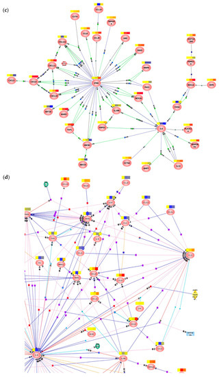 Transcriptomic analysis of tissue explants confirmed the different mucosal proteomic modulations induced by NL4.3 and by YU.2 (Figure 4a,b, Figure S5 and S6). Mapping of gene interactions 6 h post-challenge (Figure 4c) identified two nodes centered around IL-6 and IFN-γ. Interestingly, IL-6 was downregulated upon viral infection. The upregulation of IFN-γ observed only reached statistical significance in explants infected ex vivo with NL4.3 (p = 0.011766) and not with YU.2 (p = 0.110011). Modulation of this node was connected to the axis of MIG (CXCL9), IP-10 (CXCL10) and interferon-inducible T-cell alpha chemoattractant (I-TAC, CXCL10) cytokines secreted in response to IFN-γ. Analysis of samples 24 h post-challenge (Figure 4d), revealed a number of key interaction nodes focused around IL1B, CCL5, CCR7, MMP9, PPARG, MMP3, NOS2A, and PTGS2. Along with minor nodes focused on CXCL9, CXCL10, CXCL11, MMP3, CCL3, CCL8, IFI44, and IL1RN. Greater relative downregulation of IL1B in YU.2 than in NL4.3 infected explants was observed compared to control unchallenged tissue. Modulation of IL1B positively correlated with regulation of MMP3, MMP9, MMP12, PI3, and SERPINB2. These same genes showed a range of responses to NL4.3 challenge and were either unchanged (MMP3), upregulated (MMP12) or downregulated (SERPINB2).