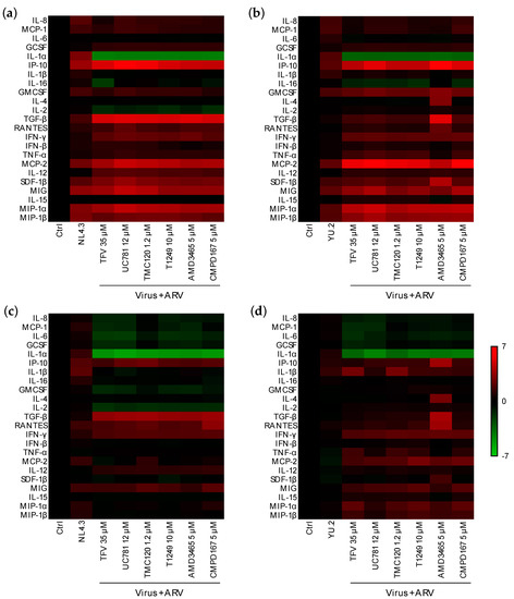 Effect of ARVs on the mucosal cytokine profile induced post-viral challenge of colorectal explants. Heatmap representing cytokines that are upregulated (red) or downregulated (green) (a,b) 6 or (c,d) 24 h after challenge in the presence or absence of ARV in comparison to untreated explants. Differences are shown in Log2 from two independent experiments performed in quadruplicate.