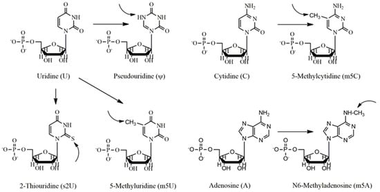 Nucleoside bases usually modified in the vaccination process. Uridine (U) is generally modified to pseudouridine (ψ), 2-thiouridine (s2U) and 5-methyluridine, cytidine (C) to 5-methylcytidine, and adenosine (A) to 5-methyladenosine (m5A).