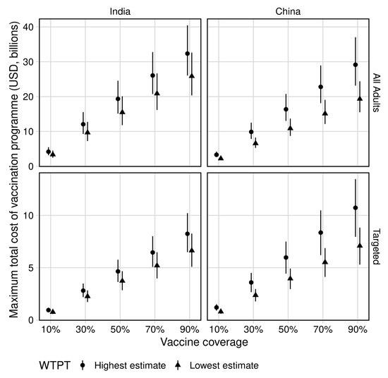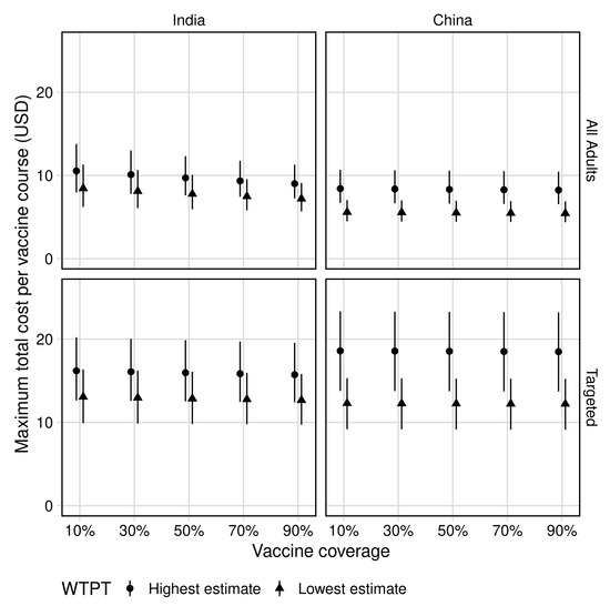 In India, mass vaccination of all adults at 70% coverage was predicted to cost up to $21 (UI 16–27) billion and $26 (UI 21–33) billion at the lower and upper WTP thresholds of $264 and $363 per DALY averted, respectively. This corresponded to a maximum total cost per course of $7 (UI 6–10) and $9 (UI 7–12) for the approximately 3 (UI 3–3) billion vaccines delivered to remain cost-effective.