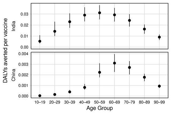 In China, we found that the most efficient age group for vaccination was older, between 60–69-year-olds, averting 1.4 (UI 1.0–1.8) million DALYs by 2050, corresponding to 0.003 (UI 0.002–0.004) DALYs averted per vaccine delivered over 451 (UI 451–452) million vaccines. In contrast to India, the optimum age group was more sharply defined, with a greater difference compared to vaccination of adjacent age groups (Figure 3). Fewer DALYs were averted per vaccine delivered across all age-groups in China compared to India.