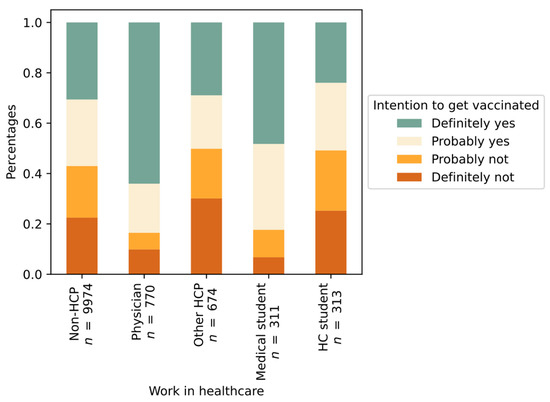 Among all respondents, 3964 (33%) indicated that they definitively intended to participate in vaccination and an additional 3119 (26%) replied that they would probably agree to vaccination; in total, 59% intended to vaccinate. As shown in Figure 1, the intention was similar for non-HCP (57%) and some groups of HCP (51% HC students, 50% other HCP), while physicians (84%) and medical students (82%) were significantly more inclined towards vaccination (p < 0.001, c = 0.158).