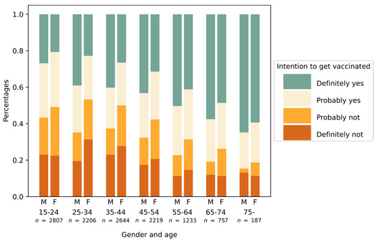 Intention to get vaccinated by age group and gender (M: male, F: female).