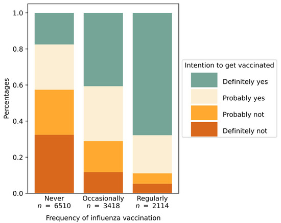 Intention to get vaccinated grouped by frequency of past influenza vaccination with shown subdivision regarding the COVID-19 vaccination intention.