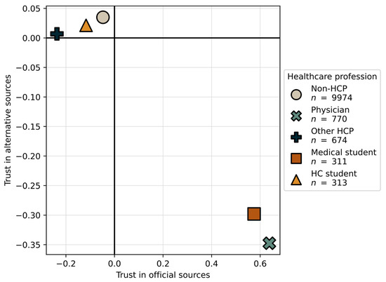 We computed mean component values for different HCP (S5: Table 1). Physicians and medical students have a positive mean value for trust in official sources and negative for trust in alternative sources, while other HCP, HC students and those respondents that are non-HCP have a negative mean value for trusting official sources and positive for alternative sources. The differences for the third component were less pronounced. Figure 4 shows the scatterplot of values for the first and second component.
