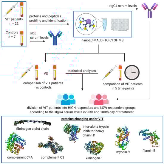 Workflow of the study (created with BioRender.com); VIT—venom immunotherapy; nanoLC-MALDI-TOF/TOF MS—nano-liquid chromatography–matrix-assisted laser desorption/ionisation–time-of-flight/time-of-flight mass spectrometry.