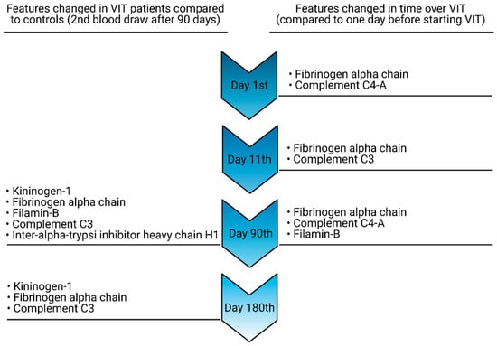 Proteomic features changing over VIT as compared to those at selected time-points with controls (left side) and patients one day before starting the treatment (right side).