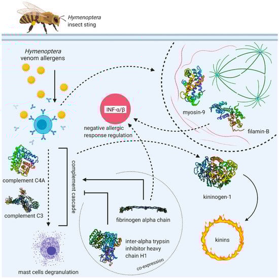 A comparison of proteomic patterns in patients undergoing VIT and allergic individuals not qualified for the therapy resulted in the identification of kininogen-1, the fibrinogen alpha chain, myosin-9, complement C3 and inter-alpha-trypsin inhibitor heavy chain H1. These results confirm that VIT triggers biochemical processes, exemplified by measurable modifications in the expressed proteome. All of the proteins that this study has identified as being changed by the progress of VIT are associated with the inflammatory response (Figure 3). The changes are comparable to those occurring as a reaction to an insect sting [23].