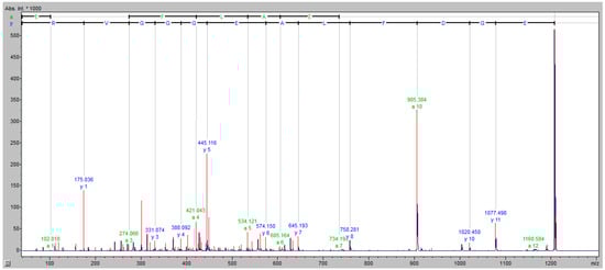 Fragmentation spectrum of peak m/z of 1207.25, identified as a fragment of the fibrinogen alpha chain; Y axis: absolute intensity x 1000; X axis: mass-to-charge ratio (m/z).