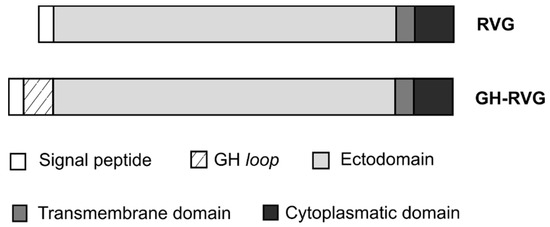 GH-RVG fusion protein structure. The coding sequence of the FMDV GH loop epitope was inserted between the glycoprotein signal peptide and the ectodomain. RVG: native rabies virus glycoprotein.
