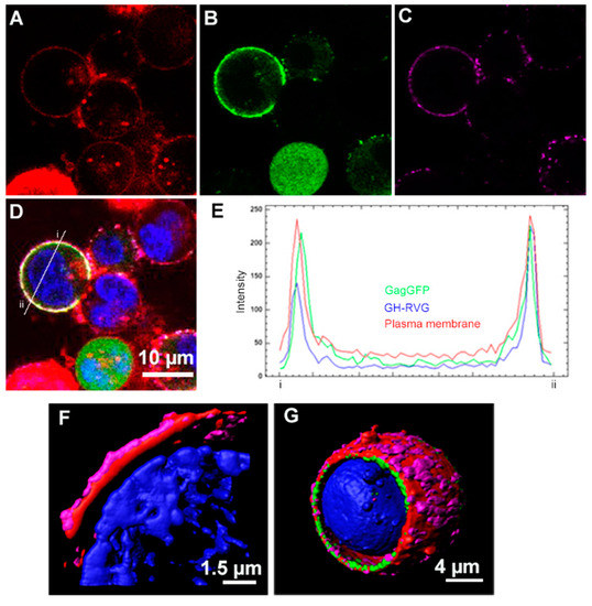 GH-RVG fusion protein expression analysis. HEK293 cells were co-transfected with GH-RVG and Gag-GFP vectors, and 72 hpt were incubated with an in-house developed RVG specific monoclonal antibody, followed by an incubation with an AlexaFluor647® conjugated anti-mouse secondary antibody (magenta). Lipid membrane was stained with CellMask™ (red) and cell nucleus was stained with Hoechst (blue). The green signal corresponds to Gag-eGFP (B) and D is the merge of the four channels. (A–D): Standard confocal laser scanning microscopy. (E): Fluorescence intensity though the diameter of the cell is represented with a histogram performed with FIJI (Image J) software. Green line corresponds to GagGFP, red line to the CellMask staining and the blue line correspond to the fluorescence intensity obtained with the immunolabeling of the cells (AlexaFluor647). (F,G): Super-resolution fluorescence microscopy. (F): expression of GH-RVG fusion glycoprotein alone. (G): Co-expression of GH-RVG and Gag-GFP fusion proteins.