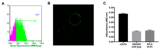 In order to analyze if the insertion of this epitope had modified the correct expression and the subcellular localization of the RVG protein, using pCiNeo-GH-RVG and pGag-EGFP plasmids, we performed a co-transfection of HEK293 cells. At 72 hpt, we analyzed the cells by standard confocal laser scanning microscopy (CLSM). As can be seen in Figure 2, the fluorescence corresponding to the anti-rabies antibody immunostaining was detected on the cell surface (Figure 2C), showing that GH-RVG is anchored in the plasma membrane, as expected for the rabies glycoprotein [30]. On the other hand, when GH-RVG was co-expressed with Gag-GFP we observed a clear overlapping of the signals, matching cell membrane staining signal (Figure 2D,E). These results showed that both chimeric proteins are found in the plasma membrane of the cell, from where VLPs bud to the supernatant [31].