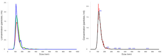Particle size distribution cVLPs. 72 hpt medium culture was harvest and clarified by 0.45 µm filtration. Fluorescent cVLPs were analyzed by nanoparticle tracking analysis using a NanoSight® NS300 device equipped with a blue laser module (488 nm). In the left part of the figure, three independent measures are graphed and, in the right, the average particle size distribution of the fluorescent cVLPs present in the supernatant is showed.