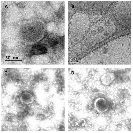 Further, cVLPs were purified by ultracentrifugation and their morphology was analyzed by transmission electron microscopy (TEM) and cryogenic electron microscopy (Cryo-TEM). As can be seen in Figure 5A,B, we observed enveloped spherical electrodense nanoparticles, as was previously described for GFP-Gag-based VLPs [15,35,36].