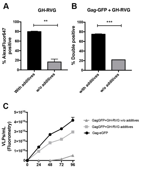 With this aim, we performed single (GH-RVG only) and double transfections (GH-RVG + Gag-GFP) of HEK239 cells and 4 hpt valproic acid and caffeine were added to the culture medium. On the one hand, 72 hpt cells were analyzed by flow cytometry in order to measure the percentage of GH-RVG positive cells (Figure 6A) or double positive cells (Figure 6B), both with or without additives. We observed that the expression level was increased by four-fold when additives were present in the culture medium after transfection.