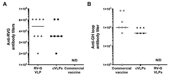 Humoral immune response triggered by cVLPs. Mice were vaccinated with three doses of cVLPs with adjuvant (n = 7). Two control groups were injected with rabies VLPs (RV-G VLPs) or a commercial FMDV vaccine (n = 8), following the same immunization protocol. Sera was obtained 15 days after the third dose and analyzed for (A): anti rabies specific antibodies, by indirect ELISA. (B): anti GH-loop FMDV epitope specific antibodies, by indirect ELISA using a synthetic peptide to coat the plates. Antibody titers were calculated as the end-point serum dilution yielding an optical density higher than the cut-off value. This cut-off was calculated as the mean + 2 S.D. of the optical density of negative controls (basal mice sera). Results are expressed as the individual titer values for each animal (dots) and the median of each group. N/D: not detectable.