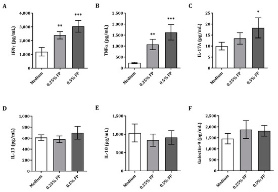 A model to study the crosstalk between IEC and innate as well as adaptive immune cells was used to investigate the immunomodulatory effects of FP. Therefore, IECs were apically exposed to FP and basolaterally to αCD3/CD28-activated PBMC for 24 h, after which cytokines were analyzed. Exposure of IEC to activated PBMC and 0.25% or 0.5% FP resulted in significantly increased Th1-type IFNγ and TNFα concentrations as compared to medium (Figure 1A,B). Th17-type IL-17A concentrations were significantly upregulated upon exposure to 0.5% FP, as compared to medium (Figure 1C). Meanwhile, Th2-type IL-13 and regulatory-type IL-10 and galectin-9 concentrations were not affected upon exposure to FP in the IEC/PBMC model (Figure 1D–F). The secretion of Th1- and Th17-type cytokines was promoted in the IEC/PBMC model upon exposure to FP.