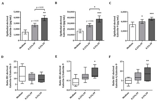 In order to analyze the epithelial cell responsiveness, after the IEC/PBMC co-culture, the IECs were washed and kept in incubation with fresh medium for an additional 24 h, after which IEC-derived mediator release was measured. Due to their involvement in the regulation of many immune processes, IEC-derived galectin concentrations were studied in the basolateral compartment. Exposure to 0.5% FP resulted in significantly increased IEC-derived galectin-3, -4 and -9 (Figure 2A–C) as compared to control or 0.25% FP. IEC-derived galectin-9 was significantly increased upon exposure to 0.25% FP (Figure 2C). Meanwhile, a tendency towards increased epithelial-derived galectin-3 and -4 (p = 0.08 and p = 0.06 respectively, Figure 2A,B) was observed upon exposure to 0.25% FP, compared to medium. Another regulatory mediator known to be produced by epithelial cells is TGFβ1, but FP did not enhance TGFβ1 concentrations above medium background levels (data not shown).