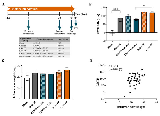 Although no significant effect was observed in the weight of the Influvac injected ears, a similar pattern compared to the ΔDTH response was observed (Figure 3C). In addition, the differences detected in the weight of the Influvac injected ears significantly correlated response with the ΔDTH (r = 0.34, p = 0.04) (Figure 3D). Due to the significantly increased vaccine-specific DTH response observed in the mice receiving 2.5% FP diet, further analyses were done in this group and its respective lactose control group.