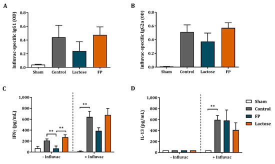 In order to measure the humoral responsiveness to the vaccine and the impact of the dietary intervention with FP, the serum of the mice was collected and vaccine-specific IgG1 and IgG2a were measured. There was an increase in IgG1 and IgG2a levels in vaccinated mice compared to non-vaccinated sham mice (Figure 4A,B). However, vaccine-specific IgG1 and IgG2a levels were not affected by the dietary interventions with FP or lactose (Figure 4A,B).