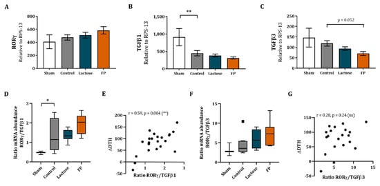 Additionally, to represent the Th17 immune versus regulatory balance in the ileum, the ratio of Th17 marker RORγ and regulatory marker TGFβ was calculated (RORγ/TGFβ1 and RORγ/TGFβ3). The RORγ/TGFβ1 ratio was significantly increased in vaccinated mice as compared to non-vaccinated mice (Figure 5D). No significant effect was found in RORγ/TGFβ1 ratio between control and FP groups (Figure 5D), although the FP showed a shift towards RORγ over TGFβ1 compared to the control and lactose groups. In addition, the correlation between RORγ/TGFβ1 ratio and ΔDTH response was studied, which showed a significant positive correlation (r = 0.59, p = 0.004, Figure 5E). No effect was found in the RORγ/TGFβ3 ratio (Figure 5F) and no correlation was found between the RORγ/TGFβ3 ratio and ΔDTH (r = 0.28, p = 0.24, Figure 5G).