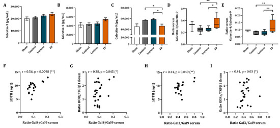 In order to connect the effects observed, such as the increase in DTH as well as of RORγ/TGFβ1 ratio in the intestine, with the serum galectin concentrations, the galectin-4/galectin-9 and galectin-3/galectin-9 ratio were correlated to RORγ/TGFβ1 ratio in the ileum as well as to ΔDTH. The serum galectin-4 over galectin-9 ratio showed a positive correlation to ΔDTH (r = 0.56, p = 0.0098, Figure 6F) and to the ratio of RORγ/TGFβ1 mRNA expression in the ileum (r = 0.38, p = 0.045, Figure 6G). Furthermore, the serum galectin-3/galectin-9 ratio was found to be significantly correlated to ΔDTH (r = 0.44, p = 0.049, Figure 6H) as well as to the ratio of RORγ/TGFβ1 mRNA expression in ileum (r = 0.41, p = 0.03, Figure 6I). Meanwhile, RORγ/TGFβ3 ratio did not show a significant correlation (Figure S4) with serum galectin-4/galectin-9 ratio (r = 0.25, p = 0.2) or galectin-3/galectin-9 ratio (r = 0.3, p = 0.12).