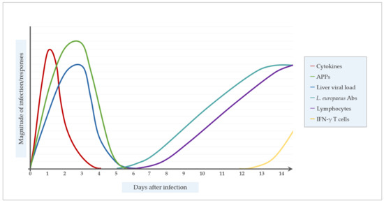 Temporal dynamic of the immune response after Lagovirus europaeus infection.; APPs, acute phase proteins; L. europaeus Abs, Lagovirus europaeus antibodies.