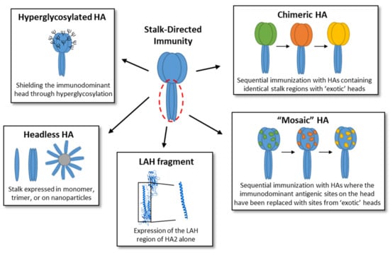 Vaccine strategies to increase stalk-directed immunity. Strategies used to induce stalk-directed immunity, such as hyperglycosylation of the HA [30,31,32], development of a headless HA [33,34,35,36,37,38,39,40,41,42,43,44,45,46,47], expression of the LAH fragment alone [48,49,50], and chimeric [51,52,53,54,55,56,57,58,59,60,61,62] and mosaic [63,64] HA proteins, have been illustrated and briefly described here.