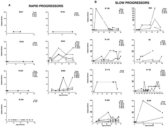 In general, Nabs developed against the early virus isolate and showed increasing titers and persistence throughout follow-up. While Nabs against viruses isolated later during follow-up were detected in eight children (six slow progressors: B3, 32, 136, 145, 190, 306, and two rapid progressors: B224 and B380). Contemporaneous Nabs, i.e., Nabs against a simultaneously isolated virus, were only detected at sporadic time points in five children, including the two rapid progressors (at titers 1/20–1/320). Thus, providing evidence of continuous emergence of escape variants. Three slow progressors (children B3, B136, B145) raised Nabs also to their CXCR4-using virus, which were isolated from the children during their follow-up. Thus, our results show that the development and persistence of autologous Nabs are common in slow progressors and rare in rapid progressors. Of note, the two rapid progressors who developed Nabs were the only still alive after four years of age.