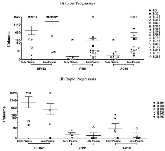 Neutralizing antibody response against heterologous PSVs in TZMbl-assay in children with slow (A) or rapid (B) disease progression. Heterologous Nab responses were tested with plasma of six rapid and 16 slow progressors, obtained within the second and/or fourth year of age. PSVs SF162 and AC10 are both subtype B and match the child’s infecting virus subtype, and PSV VI191 is subtype A. Indicated is the plasma dilution at which 50% inhibition was achieved. 1/1620 titer is used when an end-point titer was not achieved within the last plasma dilution of the test. Mean and SEM are also indicated. Comparison between groups of children showed a significant difference only for Nabs developed with late plasma against PSV AC10 (p = 0.0079, Mann-Whitney test).