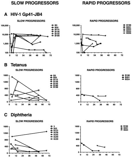 Analogously the antibody response towards tetanus and diphtheria toxoid was similar in rapid and slow progressors (Figure 4B,C). In general, the antibody titers to these antigens were higher during the first 18 months of age and eventually dropped thereafter, which clearly reflects the vaccination schedule. Thus, these data suggest that the children are capable of mounting immunodominant antibody responses independently of HIV-1 disease progression.