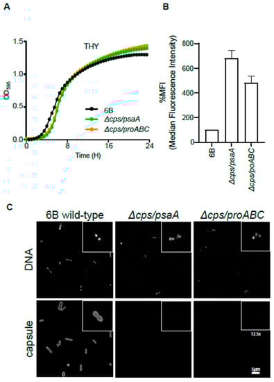 Phenotypic characterization of double unencapsulated mutants ∆cps/psaA and ∆cps/proABC. (A) Growth of wild type and unencapsulated strains ∆cps/psaA and ∆cps/proABC in THY assessed by measuring OD595 for a 24 h period. (B) Effect of the S. pneumoniae capsule on C3b deposition. Median fluorescence intensity (MFI) of C3b deposition measured using flow cytometry on the wild type 6B and unencapsulated mutants when incubated in 25% human serum. Error bars represent SDs and asterisks represent the differences between wild type and the unencapsulated mutant strain. For both mutant strains, p is < 0.0001 (one way ANOVA) compared to the wild type strain. (C) Fluorescent microscopy of wild type and unencapsulated double mutant strains following incubation with 4′,6-diamidino-2-phenylindole (DAPI) (binds to DNA to identify bacterial cells, top panels) or pneumococcal antiserum labelled with Alexa fluor 546 (recognizes serotype 6 capsule, bottom panels). The scale bar (bottom right) represents 5 µm and the inserts show a 12.5 higher magnification of selected bacteria.
