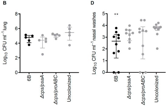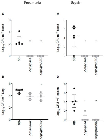 Animal data are presented as median of log10 CFU/mL (IQR) recovered from target organs after infection with wild type, ∆cps/psaA, ∆cps/proABC or PBS controls. p-Values (* < 0.05, ** < 0.01, *** < 0.001) were obtained using Kruskal–Wallis tests with Dunn’s post hoc test comparing groups to the wild type 6B strain (for virulence models), the PBS sham-colonised (for colonisation then challenge data). Quantitative results are expressed as means ± S.D or median with interquartile range for animal experiments. Statistical analyses were performed using GraphPad Prism 8 (GraphPad Software, La Jolla, CA, USA). p-Values < 0.05 (95% confidence) were considered statistically significant.