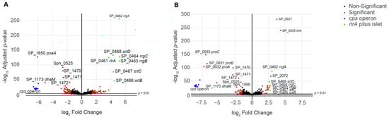 Volcano plots showing differential expression of genes in the live attenuated strains. Log2 ratio gene expression levels for the mutant strains (A) ∆cps/psaA and (B) ∆cps/proABC compared to the wild type strain. Fold change expression is represented in the X-axis, with negative values indicating genes that are under-expressed in the mutant versus the wild type, while positive fold change values indicate genes that are over-expressed in the mutant versus the wild type. The Y-axis shows the p values (as -log10 values) for differentially expressed genes. Genes belonging to cps locus are shown in blue, while those belonging to the pilus are shown in green, other genes that are differentially expressed are represented in red and all other genes are represented in black. Differential gene expression and statistical significance were analysed using the DESeq2 method. The dashed line above the x axis marks the significance threshold of p = 0.01. A full list of the genes showing differential expression with their expression levels is shown in Table S2, with selected genes of interest shown in Table 1.