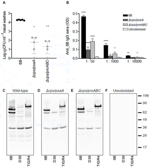 Immunoblots of S. pneumoniae lysates and whole cell ELISAs were performed as previously described [13,36]. Briefly, immunoblotting was performed using serum from S. pneumoniae colonised mice (1:200), which was detected with a 1/10,000 dilution of goat anti-mouse IgG-HRP (Abcam, UK), following probing of 10 µL aliquots of concentrated bacterial lysates from three different S. pneumoniae strains (6B, D39 and TIGR4), prepared from normalized cultures grown to OD595 0.3 and repetitive cycles of boiling and freezing. Lysates were probed with sera obtained day 28 after two episodes of colonisation with 6B, ∆cps/psaA, ∆cps/proABC, or sham colonised in order to detect IgG responses. Whole cell ELISAs were performed as previously described [13,36] incubating plates with dilutions of mouse serum for 1 h at room temperature and using HRP-conjugated goat anti mouse IgG or goat anti-mouse IgA (Abcam, UK), incubation with 50 µL TMB chromogen solution (Thermo Fisher Scientific, Waltham, MA, USA) and measuring absorbance at 450 nm using a VersaMax microplate reader.
