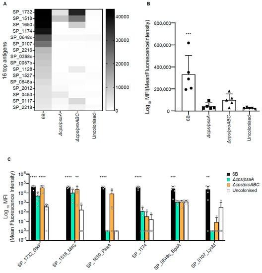 A protein microarray containing 254 major conserved S. pneumoniae proteins recognised by naturally acquired antibody found in human sera [37,41] was used to identify which protein antigens were recognised by IgG in sera from mice colonised with the wild type, ∆cps/psaA or ∆cps/proABC strains. The list of protein antigens on the array is reported in the Supplementary materials (Table S3). Comparison of the IgG-specific signal for the top 16 antigens after incubation with sera from colonized mice showed greater IgG response for the group of mice colonised with wild type 6B (Figure 5A). For the pooled data to the top 30 antigens responses for each individual mouse, only the serum from wild type colonised mice showed significantly greater IgG responses to mock colonised mice (p < 0.001) (Figure 5B). In addition, comparing the results for the most abundant protein antigens individually, IgG in sera from 6B colonized group showed statistically significant responses to the serine/threonine protease StkP (SP_1732), the transglycosidase MltG (SP_1518), PsaA (SP1650), SP_1174, BgaA (SP_0648) and the LysM domain protein (SP_0107). In contrast, sera from mice colonised with the ∆cps/proABC mutant showed significant increases in IgG just to StkP (SP_1732) and MltG (SP_1518) and sera from ∆cps/psaA colonised mice did not show any significant differences to specific antigens compared to sera from the control uncolonised group (Figure 5C). These data confirm that colonisation with the ∆cps/proABC and particularly the ∆cps/psaA strain induced weaker anti-protein antigen responses compared to colonisation with the wild type strain.