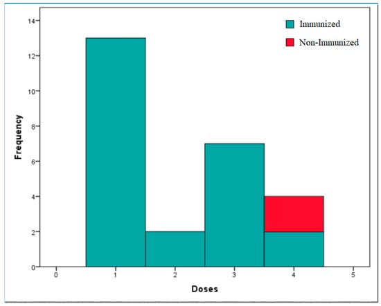 A total of 26 healthcare workers participated in the study. Participant average age was 46.12 ± 8.07 years, and 57.7% were women. Regarding dosing, 50% of the workers were inoculated with one dose (n = 13), 7.7% were inoculated with two doses (n = 2), 26.9% were inoculated with three doses (n = 7), and the remaining 15.4% were inoculated with four doses (n = 4) (Figure 1). The average antibody titer obtained from the participants was anti-HBs = 325 ± 304.9 mIU/mL, thus achieving immunity in 92.3% of healthcare workers (n = 24).