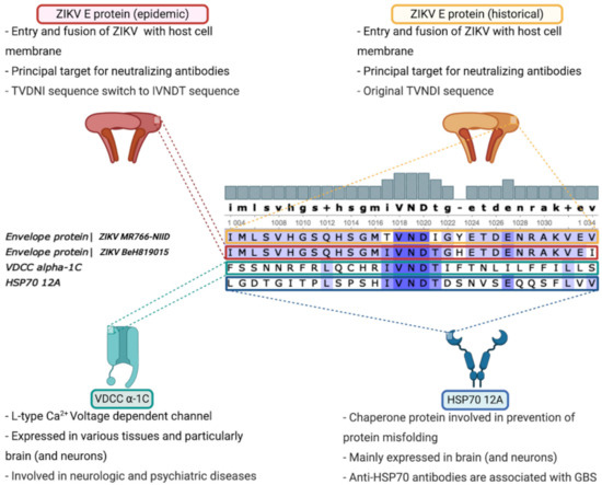 Voltage-dependent calcium channels (VDCCs) are key proteins modulating Ca2+ entry into electrically excitable cells, following depolarization. Calcium channel voltage-dependent L type α-1C subunit, also called Cav1.2, is part of L-type VDCCs family [22]. This Ca2+ channel participates in hippocampal long-term potentiation, hippocampus-dependent forms of memory, peripheral vascular resistance, cardiac inotropy or insulin secretion [22,27]. The impairment of similar channels by anti-GM1 antibodies was implicated in development of GBS [28,29]. Since anti-GM1 antibodies are found at low levels in ZIKV-induced GBS patients, it is likely that voltage-dependent Ca2+ channel is targeted by different cross-reacting antibodies. Here, we showed the existence of an IVNDT conserved sequence between Cav1.2 and ZIKV (BEH819015) envelope protein. Even if Cav1.2 has never been directly implicated into development of GBS, nor any other neuropathy, we suggest that the recognition of Cav1.2 on a neuron by cross-reacting anti-IVNDT antibodies following ZIKV infection might lead to the initiation of the immune response and development of the GBS pathophysiology (Figure 3). However, this hypothesis remains to be tested. Since Cav1.2 is mainly involved in cardiac and memory functions, the development of the symptoms associated with these functions should be expected (e.g., cardiac and psychiatric forms), but to date none was reported. Moreover, Cav1.2 folding in the region of the IVNDT pentapeptide seems to be quite far from ZIKV E glycan loop folding (Figure 2A,B). Of note, predicting Cav1.2 topology using PredictProtein [30], we noticed that IVNDT region is likely to be cytoplasmic, decreasing the probability of molecular mimicry with this candidate.