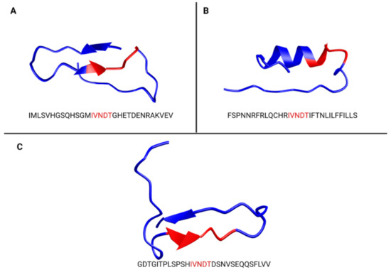 Predicted folding of epitope containing IVNDT (in red). ZIKV Asian lineage (A), VDDC alpha 1C (B) and HSP70 12 A (C). Prediction of peptide folding was done using PEP-FOLD3. HSP70 12A folding seems to be close to ZIKV E glycan loop folding, conversely to VDDC alpha 1C.