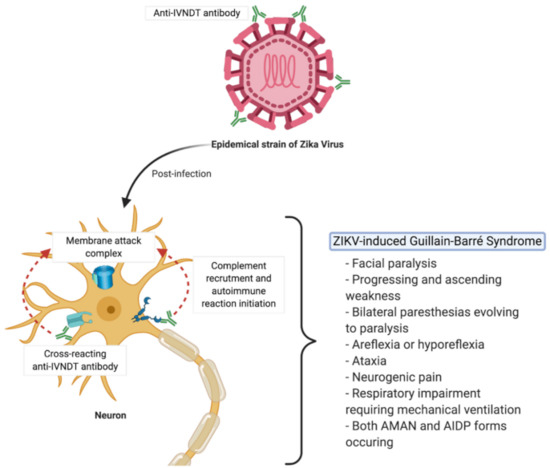 Heat Shock Proteins (HSP) are divided into subfamilies according to their theoretical molecular weights (27-kDa, 60-kDa, 70-kDa and 90-kDa). They are known for their crucial role in preventing protein misfolding and aggregation, as for their induction in case of cellular stress such as increased temperature radiation, exposure to chemicals, oxidative stress and various physiological and pathological stimuli [31]. An additional role of HSP is the participation in antigen presentation/cross-presentation [32] and inflammatory signaling [33]. Among this large family, HSP70s (to which belongs Heat Shock 70-kDa protein 12A—HSP70 12A) have been associated with autoimmune neurological disorders and more specifically immune-induced neuropathies like GBS [34]. Indeed, an increased prevalence of anti-HSP70 antibodies in GBS patients has been reported [31,35]. Here, we showed the existence of an IVNDT conserved sequence between HSP70 12A and ZIKV (BeH819015) envelope protein. As HSP70 12A is mainly expressed in neural cells of the central nervous system (CNS), such a finding might be meaningful for ZIKV-associated GBS pathophysiology insights. Additionally, in contrast to Cav1.2, HSP70 12A folding obtained via PEP-FOLD3 [18] fits well with the ZIKV E glycan loop from the Asian lineage (Figure 2A,C). Accordingly, the body of evidence would be more directed towards molecular mimicry against HSP70 12A. Based on our molecular mimicry hypothesis, it is proposed that anti-IVNDT antibodies produced during ZIKV infection cross-react with HSP70 expressed by neurons promoting complement recruitment, membrane attack complex formation and autoimmune reaction initiation (Figure 3).