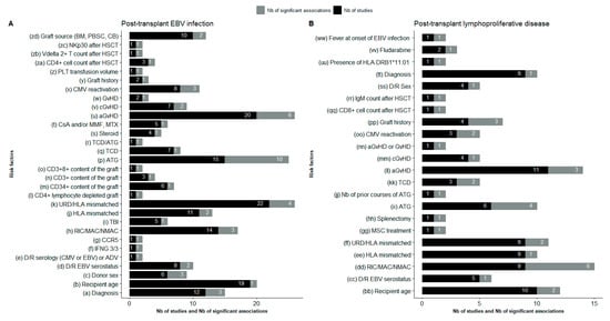 | Laberko, 2017 [69] | EBV | P and A | GvHD (yes vs. no) | HR = 1.97 (1.04–3.72); p = 0.037 | ||