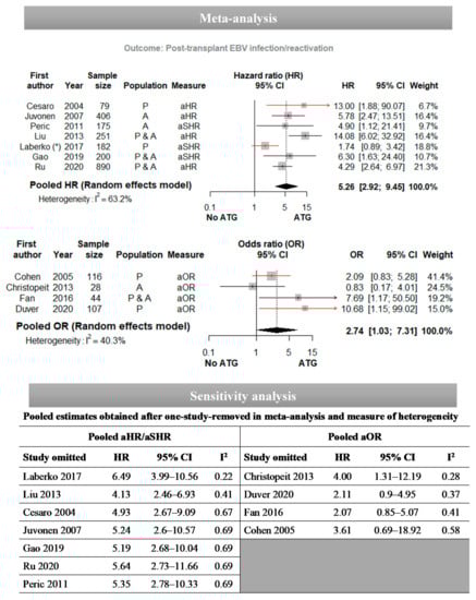 | Gao, 2019 [56] | EBV | P and A | Use of ATG (yes vs. no) | HR = 6.3 (1.6–24.0); p = 0.008 | ||