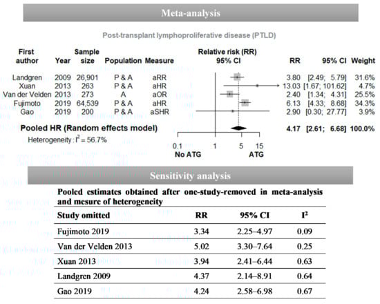 | Landgren, 2009 [70] | PTLD | P and A | Use of ATG (yes vs. no) ╪ | RR = 3.8 (2.5–5.8) | ||
