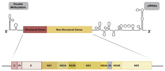 Schematic overview of the Zika virus (ZIKV) genome. The ZIKV genome is a single-stranded positive-sense RNA (+ssRNA) of approximately 11 Kb and codes a polyprotein which is cleaved in the endoplasmic reticulum (ER) lumen by the host and/or viral proteases to release three structural proteins (C, PrM and E; red boxes) and seven non-structural proteins (NS1, NS2A, NS2B, NS3, NS4A, NS4B and NS5; yellow boxes). The 5′ untranslated region (UTR) is susceptible for specific double methylation (represented in grey box at left) by the viral C-terminal methyltransferase domain of NS5 to behave like messenger RNA (mRNA) and hijacks host factors for translation and for masking the viral RNA to prevent cellular recognition and degradation. UTR loops at 3′ end are subgenomic flavivirus RNAs (sfRNAs) (shown in the grey box on the right), that play a role in the immune response evasion (see Section 2.4 in the main text).