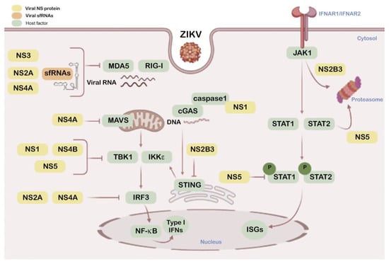 Due to the enormous challenge to develop a ZIKV vaccine [125,126,127,128,129], it is still not possible to immunize against ZIKV infection and associated pathology. Furthermore, the understanding of the immune events underlying ZIKV infection, transmission and pathology is key for meeting this ZIKV challenge. Based on the above, the present article aims to review the mechanisms of ZIKV immune evasion related to viral non-structural (NS) proteins, genomic and non-coding viral RNA, as well as microRNA (miRNA) generated during ZIKV infection to modulate cellular environment, in order to escape immunity and cause ZIKV complex pathology.