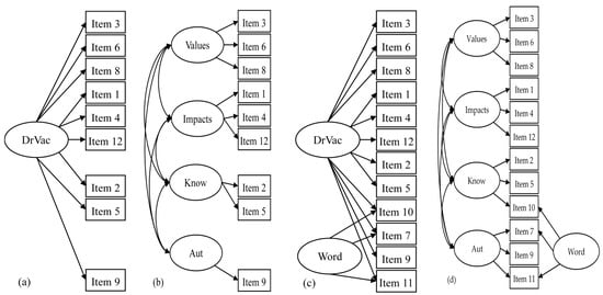 The four confirmatory factor analysis models for the Drivers of COVID-19 Vaccination Acceptance Scale (DrVac-COVID19S) tested in the present study. (a) One-trait-factor model using 9 positively worded items; (b) Four-trait-factor model using 9 positively worded items; (c) One-trait-factor and two-minus-one-method-factor model using all 12 items; (d) Four-trait-factor and two-minus-one-method-factor model using all 12 items. Note: error terms are not presented in the figure. DrVac = DrVac-COVID19S; Know = knowledge; Aut = autonomy; Word = negative wording effect.