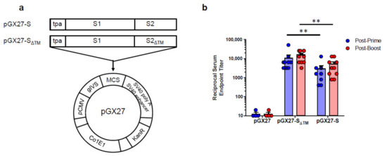 Diagram and immunogenicity of SARS-CoV-2 DNA vaccines. Schematic diagram of COVID-19 DNA vaccine expressing soluble SARS-CoV-2 S protein (SΔTM) or full-length SARS-CoV-2 S protein (S) (a). BALB/c mice (n = 4–10/group) were immunized at weeks 0 and 2 with pGX27-SΔTM, pGX27-S, or pGX27 (empty control vector) as described in the Methods. Sera were collected at 2 weeks post-prime (blue) and 2 weeks post-boost (red) and evaluated for SARS-CoV-2 S-specific IgG antibodies (b). All data are represented as individual values. ** p < 0.01 as determined by the Mann–Whitney test.