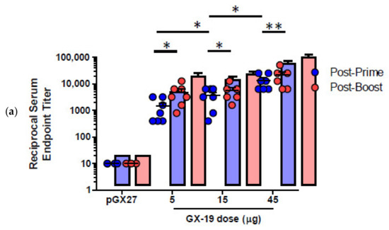 Mouse immunizations. Female BALB/c mice aged 6–8 weeks (Koatech, Pyeongtaek-sk, Gyeonggi-do, Republic of Korea) were immunized with GX-19 vaccine or pGX27 in a total volume of 50 µL of PBS into the tibialis anterior muscle with in vivo electroporation with OrbiJector® (SL VAXiGEN Inc, Seongnam-si, Gyeonggi-do, Republic of Korea) at weeks 0 and 2. On days 14 and 28, blood or BAL (bronchoalveolar lavage) fluid was collected, and mice were sacrificed 14 days after final immunization.